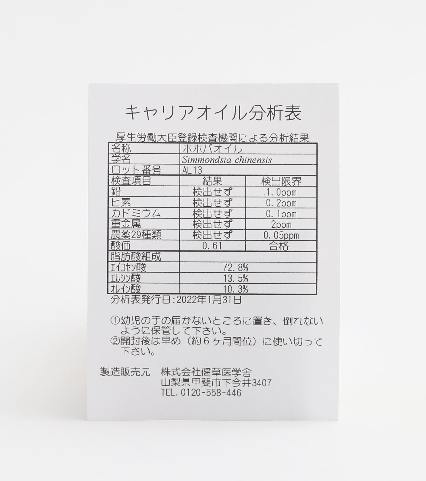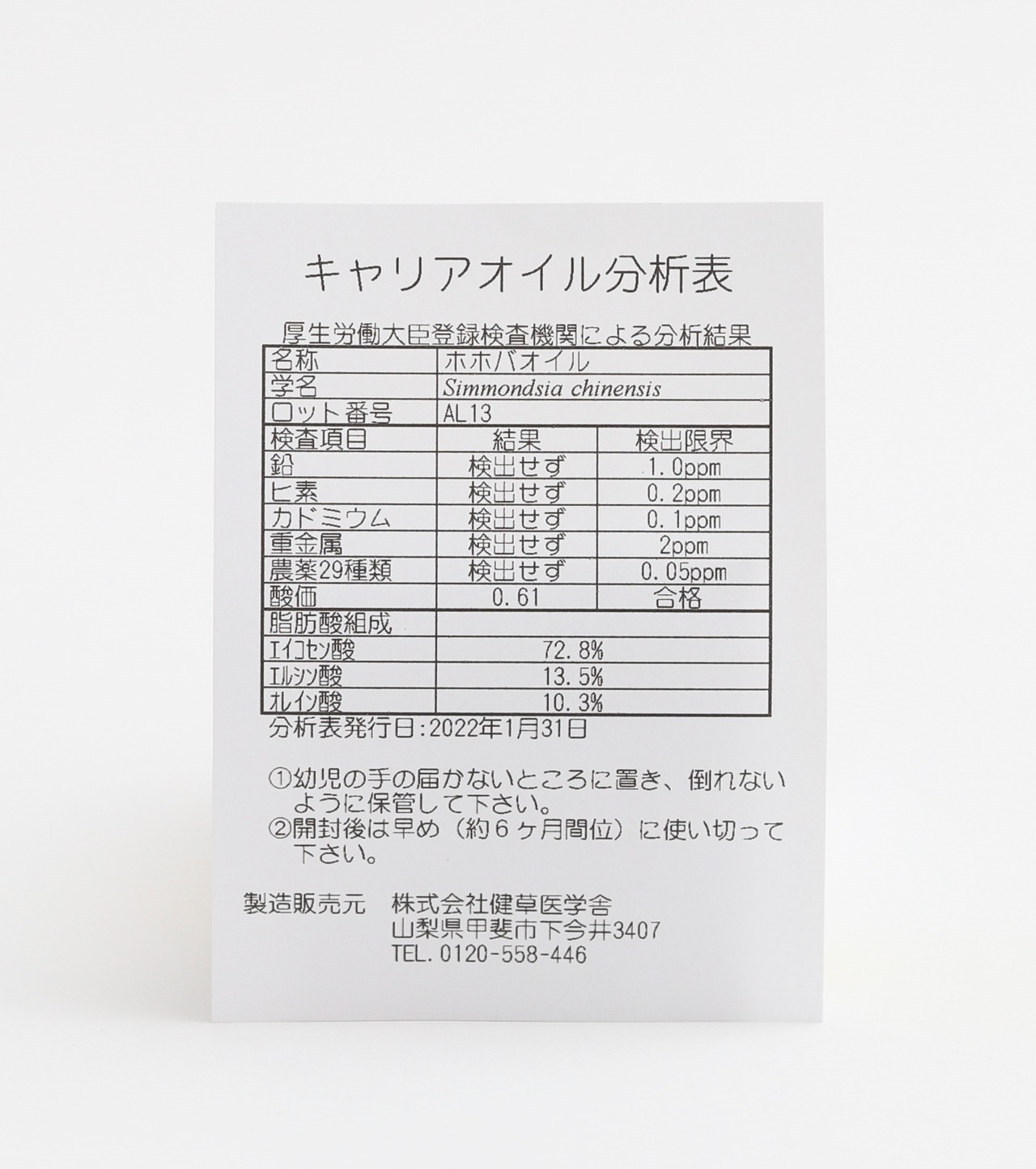 酸化しにくく、保存性に優れたオイル。あらゆる肌質におすすめですが、特に乾燥がちなお肌に適しています。10〜15°C以下になると固化し白濁しますが、温かい場所に戻すと液状に戻ります。